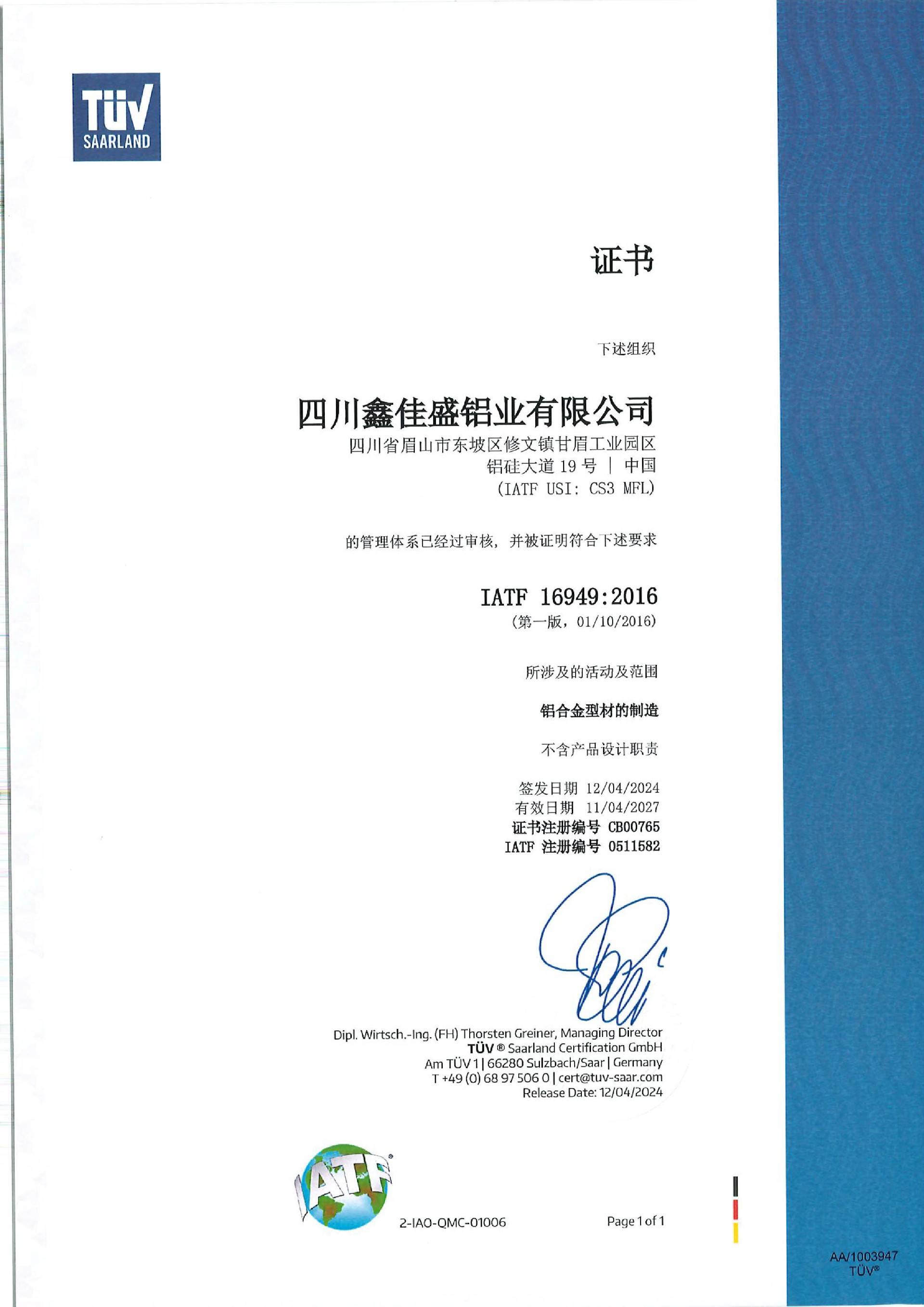 四川鑫佳盛鋁業(yè)經(jīng)過(guò)全階段審查,順利獲得由TüV Saarland頒發(fā)的IATF16949:2016的管理體系證書,有效期從2024年4月12日至2027年4月11日。IATF16949是國(guó)際汽車行業(yè)的技術(shù)規(guī)范,是基于ISO9001的基礎(chǔ),加進(jìn)了汽車行業(yè)的技術(shù)規(guī)范,此規(guī)范完全和ISO9001:2015保持一致。但更重于缺陷防范,減少在汽車零部件供應(yīng)鏈中容易產(chǎn)生的質(zhì)量波動(dòng)和浪費(fèi)。