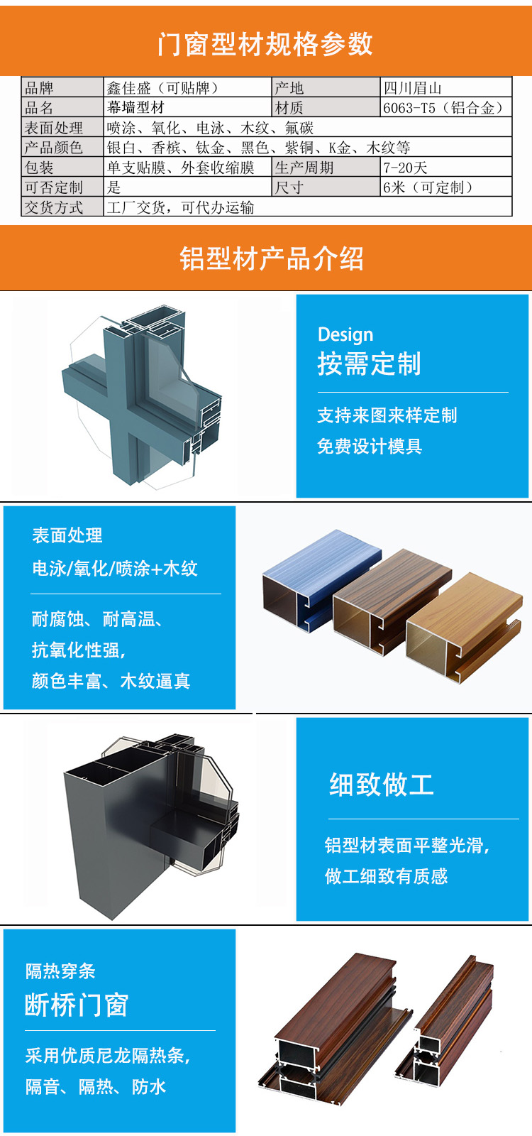 鑫佳盛生產(chǎn)的鋁合金建筑型材產(chǎn)品具有強度高、重量輕、耐腐蝕、裝飾性好、使用壽命長、色彩豐富等優(yōu)點。
