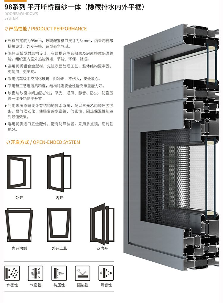 利用等壓原理設(shè)計(jì)有結(jié)構(gòu)的排水系統(tǒng),配以三元乙丙等壓腔膠條,耐氣候老化,使整窗的水密性、氣密性、隔熱保溫性能達(dá) 到最佳效果。