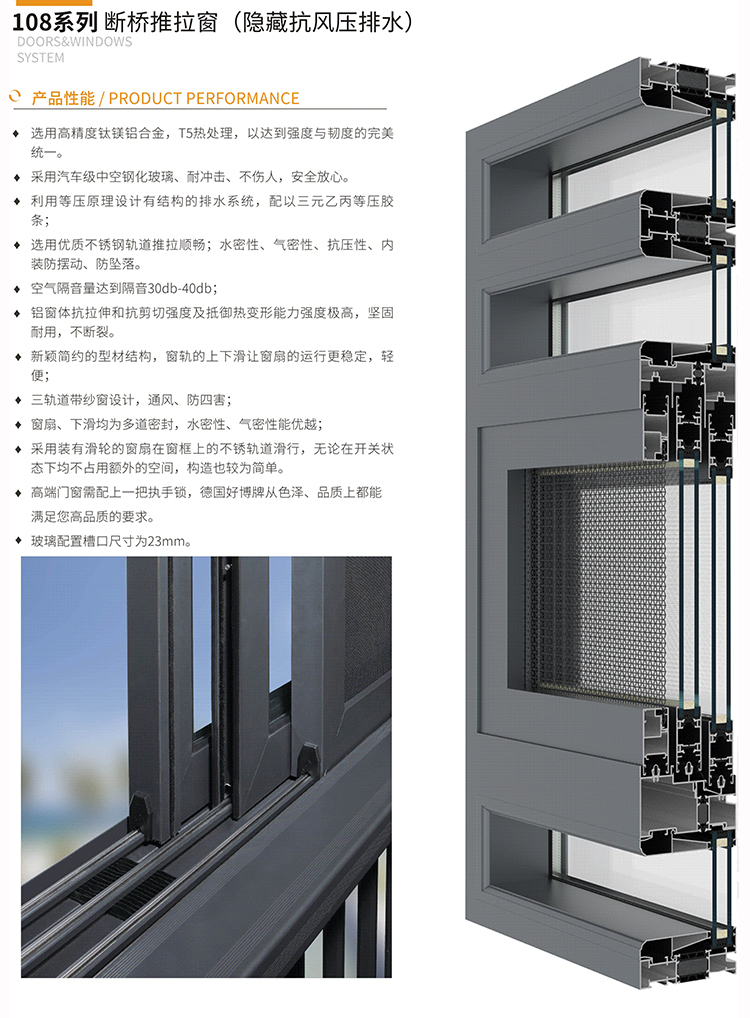 選用優(yōu)質(zhì)不銹鋼軌道推拉順暢;水密性、氣密性、抗壓性、內(nèi)裝防擺動(dòng)、防墜落。